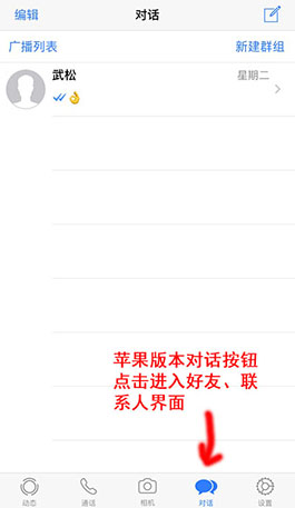 选择whatsapp标识联系人,点击信息或者通话按钮,进行一次信息发送或者语音通话,对方被自动添加到对话界面(好友)。